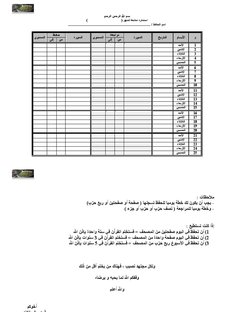 استمارة متابعة حفظ ومراجعة القرآن الكريم للطباعة موقع المحيط