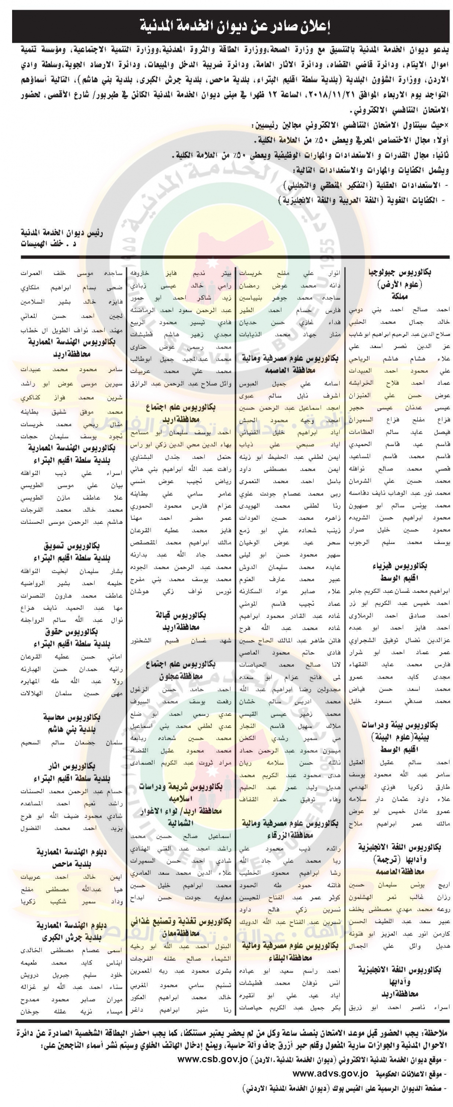 يعلن ديوان الخدمة المدنية عن اسماء الدفعة الاولى من تعيينات 2019 في وزارات ومؤسسات حكومية