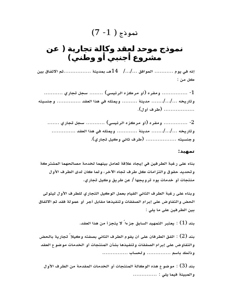 صيغة و نموذج عقد اتفاق مع وكيل. على الطرف الثانى ابرام التعاقدات باسمه الشخصى فان أبرمها باسم الطرف الاول فلا يستحق عمولة عنها و هو دائما ضامنا يسار العميل بحيث ان اخل الاخير بالتزامه بالوفاء لاى سبب تعين على الطرف الثانى الوفاء ككفيل فضلا عن. عقد بيع ابتدائي لحصة علي المشاع عقد بيع إبتدائي لأرض.